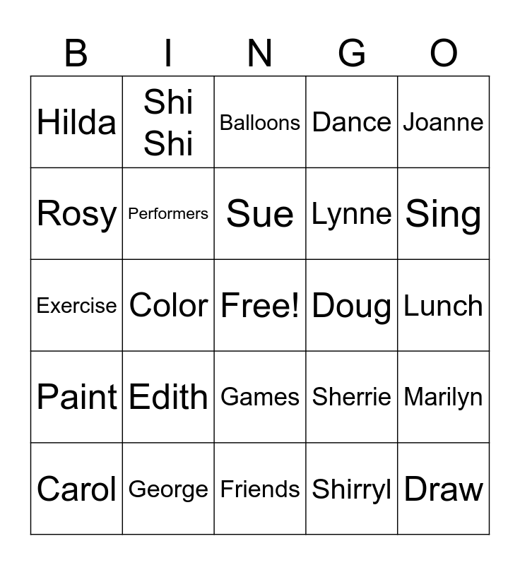 This bingo card has a free space and 24 words: Edith, George, Sue, Carol, Joanne, Hilda, Rosy, Shi Shi, Doug, Games, Lynne, Exercise, Sherrie, Marilyn, Performers, Shirryl, Lunch, Balloons, Sing, Color, Draw, Paint, Dance and Friends.