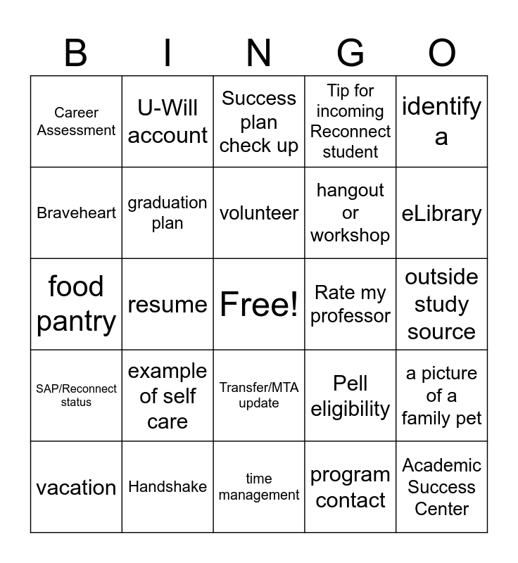 This bingo card has a free space and 30 words: Handshake, Career Services, resume, job posting, Career Assessment, Success plan check up, graduation plan, Transfer/MTA update, Rate my professor, time management, outside study source, Academic Success Center, program contact, learning style, eLibrary, scholarship for you, Pell eligibility, SAP/Reconnect status, example of self care, identify a, food pantry, hardship resource, U-Will account, hangout or workshop, Braveheart, Tip for incoming Reconnect student, a picture of a family pet, vacation, volunteer and Student organization.