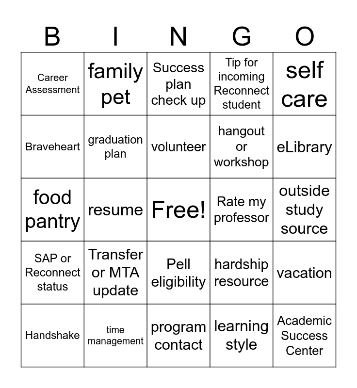 This bingo card has a free space and 29 words: Handshake, Career Services, resume, job posting, Career Assessment, Success plan check up, graduation plan, Transfer or MTA update, Rate my professor, time management, outside study source, Academic Success Center, program contact, learning style, eLibrary, scholarship for you, Pell eligibility, SAP or Reconnect status, self care, food pantry, hardship resource, U-Will, hangout or workshop, Braveheart, Tip for incoming Reconnect student, family pet, vacation, volunteer and Student organization.