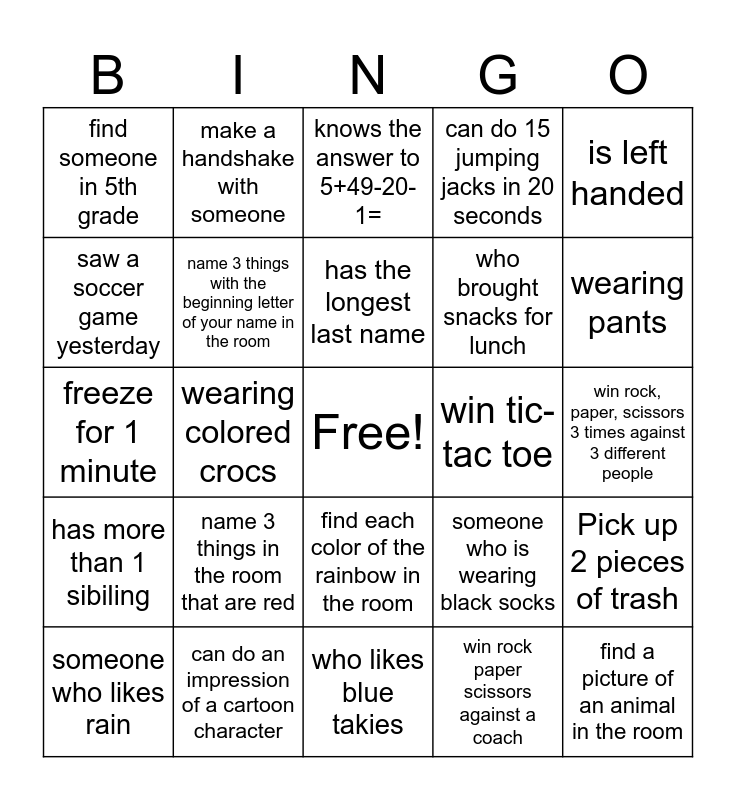 This bingo card has a free space and 24 words: name 3 things in the room that are red, can do an impression of a cartoon character, has the longest last name, someone who likes rain, is left handed, find someone in 5th grade, saw a soccer game yesterday, make a handshake with someone, win tic-tac toe, find each color of the rainbow in the room, who brought snacks for lunch, freeze for 1 minute, someone who is wearing black socks, Pick up 2 pieces of trash, name 3 things with the beginning letter of your name in the room, win rock paper scissors against a coach, win rock, paper, scissors 3 times against 3 different people, knows the answer to 5+49-20-1=, wearing pants, wearing colored crocs, find a picture of an animal in the room, has more than 1 sibiling, can do 15 jumping jacks in 20 seconds and who likes blue takies.