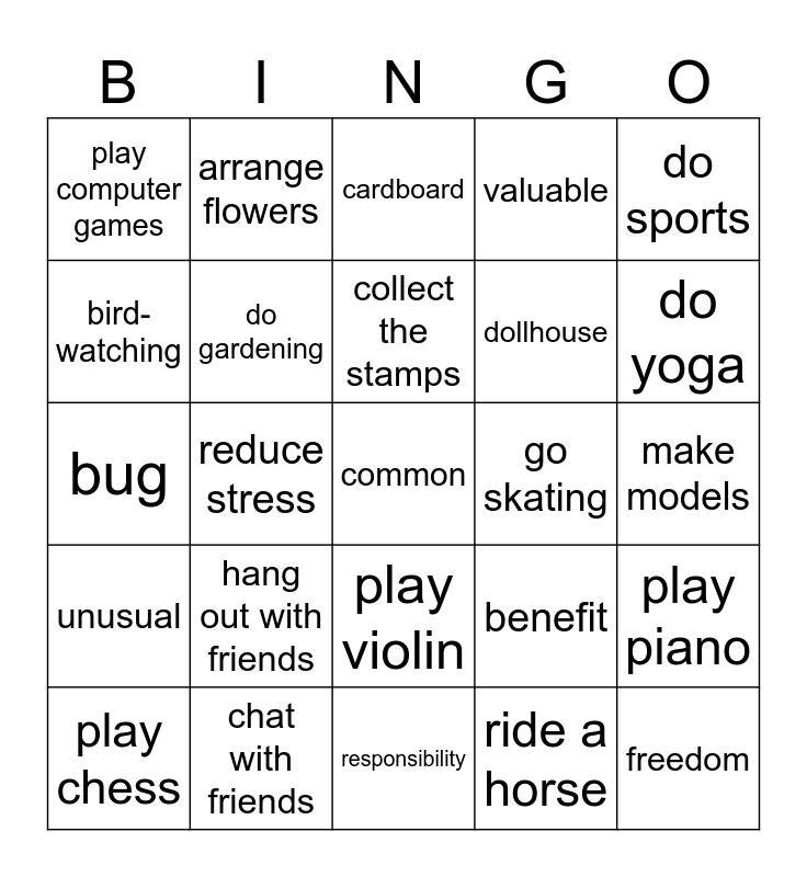 This bingo card has a free space and 24 words: hang out with friends, chat with friends, collect the stamps, play chess, do sports, play computer games, bird-watching, arrange flowers, go skating, play violin, dollhouse, bug, benefit, play piano, do gardening, ride a horse, make models, cardboard, do yoga, reduce stress, freedom, unusual, valuable and responsibility.