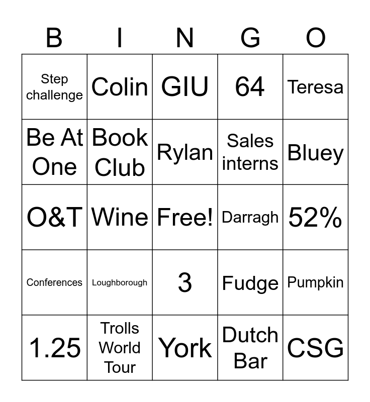 This bingo card has a free space and 49 words: NBCU, CSG, Leeds, York, Loughborough, 7, Colin, Seven Dials Market, Be At One, Arcade, Book Club, 64, Pumpkin, Fudge, CNBC, Million Makers, Rylan, Darragh, Reach, Teresa, Wine, Dutch Bar, Step challenge, Sales interns, Gluten, Bluey, 1.25, Cold, 3, Conferences, Georgie, Hannah, Nancy, The Fall Guy, Trolls World Tour, DM4, Argylle, Lemon and ginger tea, 52%, Oat, Digital-i, Techedge, ITVR, C-Suite, O&T, GIU, Spelling, Bowling and Murder.