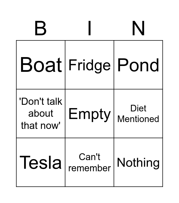 This bingo card has 9 words: Tesla, Pond, Fridge, 'Don't talk about that now', Boat, Diet Mentioned, Empty, Nothing and Can't remember.