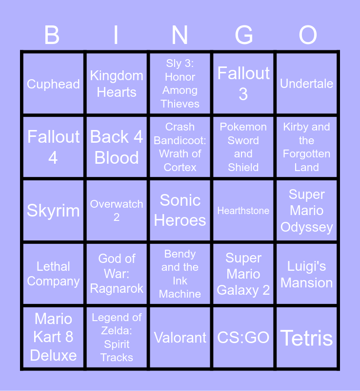 This bingo card has 35 words: Halo, Fortnite, Left 4 Dead 2, Back 4 Blood, Bendy and the Ink Machine, Fallout 3, Fallout 4, Celeste, Crash Bandicoot: Wrath of Cortex, Legend of Zelda: Tears of the Kingdom, Skyrim, Undertale, Deltarune, ChronoTrigger, Cuphead, Hearthstone, CS:GO, Overwatch 2, Lethal Company, Sonic Heroes, Super Mario Galaxy 2, Mario Kart 8 Deluxe, Luigi's Mansion, Legend of Zelda: Spirit Tracks, Sly 3: Honor Among Thieves, Kirby and the Forgotten Land, Tetris, Pokemon Go, Pokemon Sword and Shield, Super Mario Odyssey, Persona 5, Valorant, God of War: Ragnarok, Kingdom Hearts and Super Smash Bros: Brawl.
