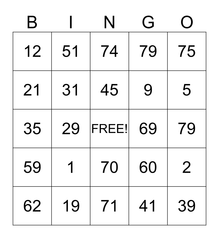 This bingo card has a free space and 24 words: 1, 19, 45, 62, 75, 12, 21, 51, 69, 70, 9, 35, 60, 2, 31, 41, 79, 74, 5, 29, 39, 59, 79 and 71.