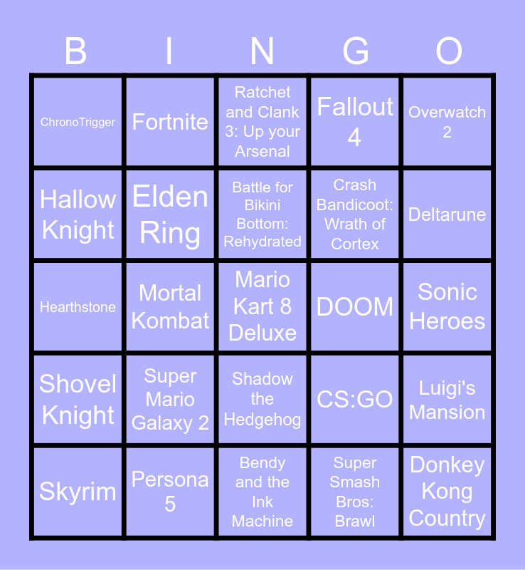 This bingo card has 71 words: Halo, Fortnite, Left 4 Dead 2, Back 4 Blood, Bendy and the Ink Machine, Fallout 3, Fallout 4, Celeste, Crash Bandicoot: Wrath of Cortex, Legend of Zelda: Tears of the Kingdom, Skyrim, Undertale, Deltarune, ChronoTrigger, Cuphead, Hearthstone, CS:GO, Overwatch 2, Lethal Company, Sonic Heroes, Super Mario Galaxy 2, Mario Kart 8 Deluxe, Luigi's Mansion, Legend of Zelda: Spirit Tracks, Sly 3: Honor Among Thieves, Kirby and the Forgotten Land, Tetris, Pokemon Go, Pokemon Sword and Shield, Super Mario Odyssey, Persona 5, Valorant, God of War: Ragnarok, Kingdom Hearts, Super Smash Bros: Brawl, Silent Hill, Assassin's Creed: Unity, Assassin's Creed 2, Hallow Knight, Risk of Rain 2, Shadow the Hedgehog, Donkey Kong Country, Shovel Knight, Ni No Kuni, Journey, Geometry Dash, Plants Vs. Zombies, Elden Ring, Pac Man 99, Animal Crossing, Candy Crush Saga, Diablo IV, DOOM, Stardew Valley, PlateUp!, Overcooked, Battle for Bikini Bottom: Rehydrated, Spyro, Kirby's Adventure, Minecraft, Sonic Unleashed, Fall Guys, Mortal Kombat, Phoenix Wright Ace Attorney, Frogger 2: Swampy's Revenge, Destroy All Humans, Ratchet and Clank 3: Up your Arsenal, Doki Doki Literature Club, Among Us, Apex Legends and Portal.