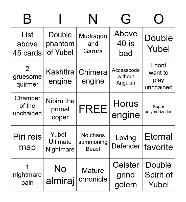 This bingo card has a free space and 24 words: Yubel - Ultimate Nightmare, No almiraj, Chimera engine, 1 nightmare pain, Double Yubel, List above 45 cards, 2 gruesome quirmer, Double phantom of Yubel, Horus engine, No chaos summoning Beast, Accesscode without Anguish, Chamber of the unchained, Loving Defender, Eternal favorite, Kashtira engine, Geister grind golem, Super polymerization, Mudragon and Garura, I dont want to play unchained, Nibiru the primal coper, Double Spirit of Yubel, Piri reis map, Above 40 is bad and Mature chronicle.