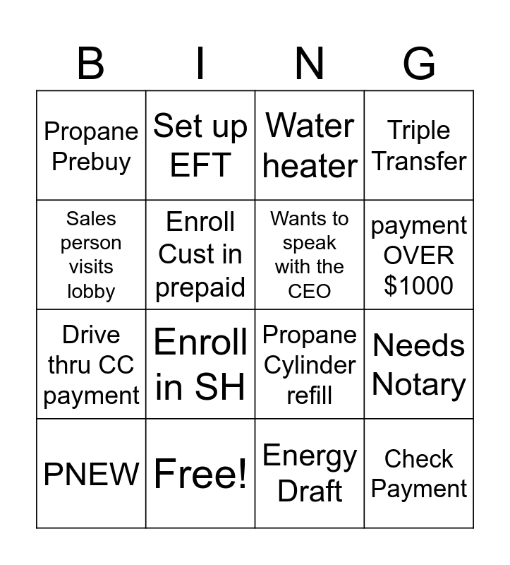This bingo card has 16 words: Free!, Needs Notary, Water heater, Propane Prebuy, Drive thru CC payment, Set up EFT, Propane Cylinder refill, Energy Draft, Sales person visits lobby, Enroll Cust in prepaid, PNEW, Triple Transfer, Enroll in SH, payment OVER $1000, Wants to speak with the CEO and Check Payment.