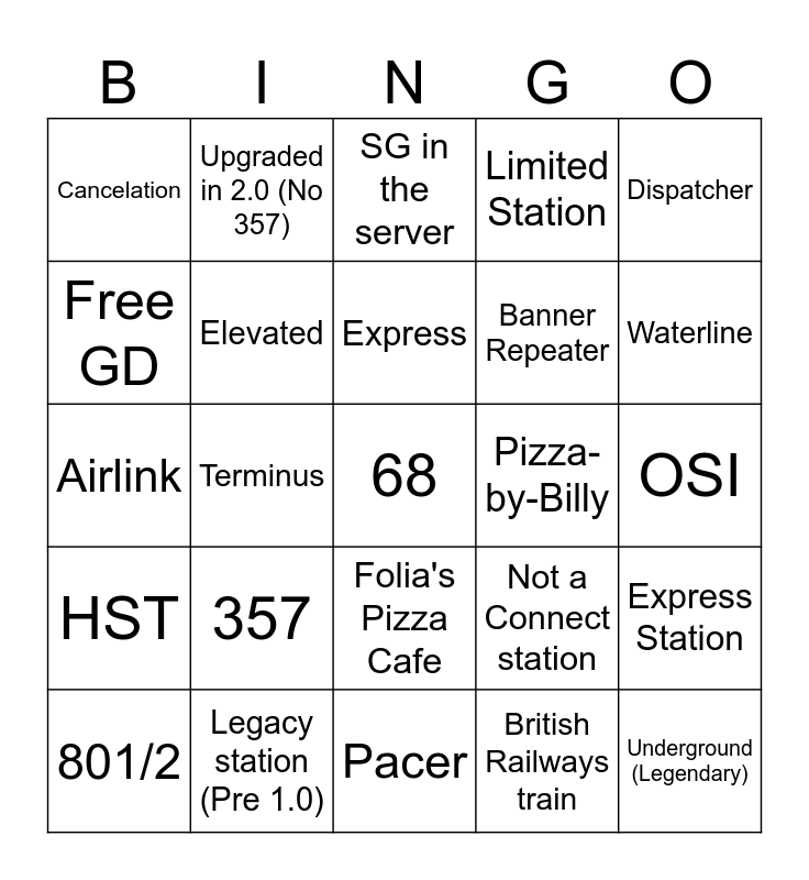 This bingo card has 25 words: 357, Pacer, Express, 801/2, Dispatcher, Cancelation, Free GD, Upgraded in 2.0 (No 357), Pizza-by-Billy, Folia's Pizza Cafe, Banner Repeater, Airlink, Not a Connect station, Express Station, Elevated, Underground (Legendary), OSI, SG in the server, Waterline, Terminus, 68, Legacy station (Pre 1.0), HST, Limited Station and British Railways train.