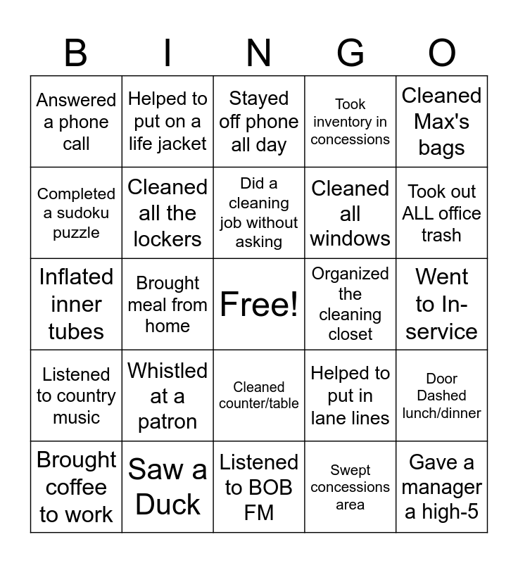 This bingo card has a free space and 24 words: Brought coffee to work, Whistled at a patron, Did a cleaning job without asking, Swept concessions area, Cleaned Max's bags, Answered a phone call, Helped to put on a life jacket, Stayed off phone all day, Organized the cleaning closet, Went to In-service, Inflated inner tubes, Cleaned all the lockers, Helped to put in lane lines, Door Dashed lunch/dinner, Completed a sudoku puzzle, Saw a Duck, Listened to BOB FM, Took inventory in concessions, Took out ALL office trash, Listened to country music, Brought meal from home, Cleaned counter/table, Cleaned all windows and Gave a manager a high-5.