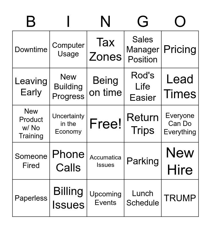 This bingo card has a free space and 24 words: Phone Calls, Billing Issues, Being on time, Paperless, Pricing, Downtime, Leaving Early, Computer Usage, Return Trips, Accumatica Issues, Rod's Life Easier, New Product w/ No Training, Parking, New Hire, New Building Progress, Lunch Schedule, Everyone Can Do Everything, Tax Zones, Lead Times, Uncertainty in the Economy, TRUMP, Someone Fired, Sales Manager Position and Upcoming Events.