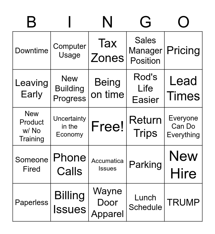 This bingo card has a free space and 24 words: Phone Calls, Billing Issues, Being on time, Paperless, Pricing, Downtime, Leaving Early, Computer Usage, Return Trips, Accumatica Issues, Rod's Life Easier, New Product w/ No Training, Parking, New Hire, New Building Progress, Lunch Schedule, Everyone Can Do Everything, Tax Zones, Lead Times, Uncertainty in the Economy, TRUMP, Someone Fired, Sales Manager Position and Wayne Door Apparel.