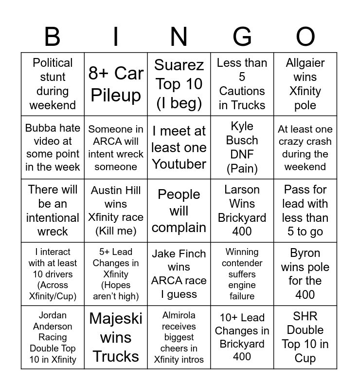 This bingo card has a free space and 24 words: 5+ Lead Changes in Xfinity (Hopes aren’t high), Majeski wins Trucks, I meet at least one Youtuber, Jordan Anderson Racing Double Top 10 in Xfinity, Allgaier wins Xfinity pole, Political stunt during weekend, Bubba hate video at some point in the week, 8+ Car Pileup, Larson Wins Brickyard 400, Jake Finch wins ARCA race I guess, Kyle Busch DNF (Pain), There will be an intentional wreck, Winning contender suffers engine failure, Byron wins pole for the 400, Someone in ARCA will intent wreck someone, 10+ Lead Changes in Brickyard 400, Pass for lead with less than 5 to go, Suarez Top 10 (I beg), At least one crazy crash during the weekend, Austin Hill wins Xfinity race (Kill me), SHR Double Top 10 in Cup, I interact with at least 10 drivers (Across Xfinity/Cup), Less than 5 Cautions in Trucks and Almirola receives biggest cheers in Xfinity intros.
