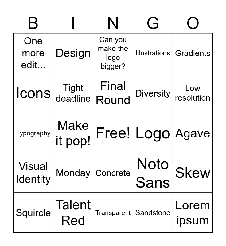 This bingo card has a free space and 29 words: Squircle, Robert Half, Make it pop!, Canva, One more edit..., Can you make the logo bigger?, Tight deadline, Monday, Logo, Talent Red, Agave, Lorem ipsum, Transparent, Sandstone, Low resolution, Marigold, Concrete, Visual Identity, Gradients, Typography, Noto Sans, Photography, Diversity, Icons, Illustrations, Design, Skew, Final Round and GIF.