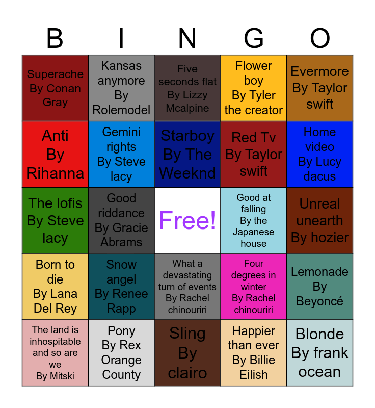 This bingo card has a free space and 24 words: The land is inhospitable and so are we By Mitski, Snow angel By Renee Rapp, Starboy By The Weeknd, Happier than ever By Billie Eilish, Evermore By Taylor swift, Superache By Conan Gray, Kansas anymore By Rolemodel, Five seconds flat By Lizzy Mcalpine, Good at falling By the Japanese house, Unreal unearth By hozier, The lofis By Steve lacy, Gemini rights By Steve lacy, Four degrees in winter By Rachel chinouriri, Lemonade By Beyoncé, Anti By Rihanna, Pony By Rex Orange County, Sling By clairo, Flower boy By Tyler the creator, Home video By Lucy dacus, Born to die By Lana Del Rey, Good riddance By Gracie Abrams, What a devastating turn of events By Rachel chinouriri, Red Tv By Taylor swift and Blonde By frank ocean.