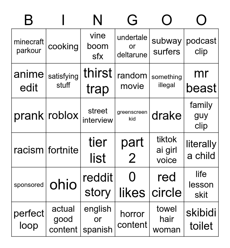 This bingo card has 48 words: the word potatoe, prank, ai music, tiktok ai girl voice, drake, 0 likes, cooking, blatant misinformation, podcast clip, actual good content, anime edit, undertale or deltarune, fortnite, racism, skibidi toilet, reddit story, satisfying stuff, roblox, sexism, subway surfers, mr beast, literally a child, minecraft parkour, thirst trap, anything to do with a president, random movie, tier list, title as a date, family guy clip, greenscreen kid, dead meme, ohio, towel hair woman, the word gyatt, part 2, english or spanish, horror content, street interview, perfect loop, useless reaction, red circle, sponsored, vine boom sfx, giving to homeless people, something illegal, overused audio, life lesson skit and "and that's why".