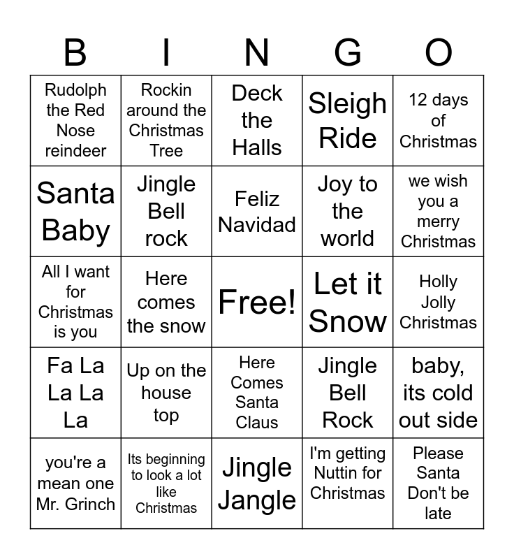 This bingo card has a free space and 26 words: Here Comes Santa Claus, I'm getting Nuttin for Christmas, Feliz Navidad, Its beginning to look a lot like Christmas, 12 days of Christmas, Rudolph the Red Nose reindeer, Santa Baby, Rockin around the Christmas Tree, Holly Jolly Christmas, Jingle Bell Rock, Joy to the world, All I want for Christmas is you, baby, its cold out side, you're a mean one Mr. Grinch, Here comes the snow, white Christmas, Sleigh Ride, Fa La La La La, Deck the Halls, Please Santa Don't be late, we wish you a merry Christmas, Jingle Jangle, Let it Snow, Up on the house top, Jingle Bell rock and All I want for Christmas.
