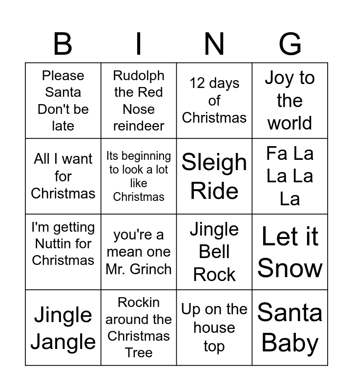 This bingo card has 28 words: Free!, Here Comes Santa Claus, I'm getting Nuttin for Christmas, Feliz Navidad, Its beginning to look a lot like Christmas, 12 days of Christmas, Rudolph the Red Nose reindeer, Santa Baby, Rockin around the Christmas Tree, Holly Jolly Christmas, Jingle Bell Rock, Joy to the world, All I want for Christmas is you, baby, its cold out side, you're a mean one Mr. Grinch, Here comes the snow, white Christmas, Sleigh Ride, Fa La La La La, Deck the Halls, Please Santa Don't be late, we wish you a merry Christmas, Jingle Jangle, Let it Snow, Up on the house top, Jingle Bell rock, All I want for Christmas and Free.