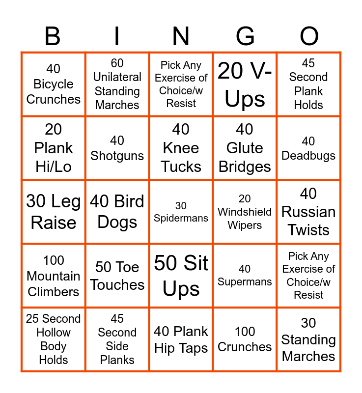 This bingo card has 26 words: 50 Sit Ups, 100 Crunches, 40 Knee Tucks, 45 Second Side Planks, 45 Second Plank Holds, 40 Bicycle Crunches, 20 Plank Hi/Lo, 60 Unilateral Standing Marches, 40 Russian Twists, 40 Supermans, 40 Glute Bridges, 30 Leg Raise, Pick Any Exercise of Choice/w Resist, 25 Second Hollow Body Holds, 40 Bird Dogs, 25 Hanging Knee Tucks, 20 V-Ups, 100 Mountain Climbers, Pick Any Exercise of Choice/w Resist, 30 Spidermans, 40 Deadbugs, 40 Plank Hip Taps, 20 Windshield Wipers, 50 Toe Touches, 40 Shotguns and 30 Standing Marches.