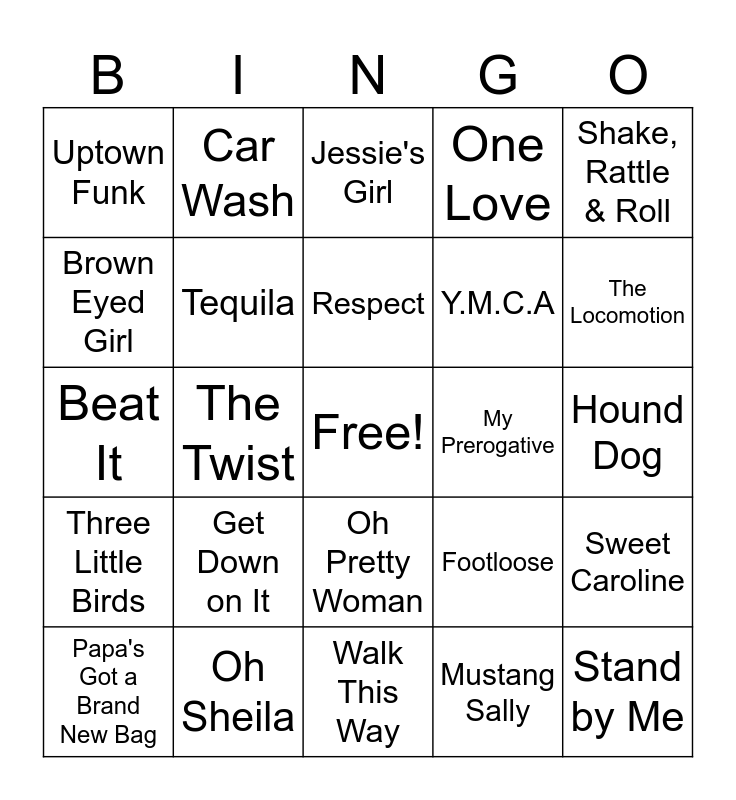 This bingo card has a free space and 24 words: Get Down on It, Oh Sheila, Respect, Papa's Got a Brand New Bag, Shake, Rattle & Roll, Uptown Funk, Brown Eyed Girl, Car Wash, My Prerogative, Oh Pretty Woman, Y.M.C.A, Beat It, Footloose, Sweet Caroline, Tequila, Mustang Sally, Hound Dog, Jessie's Girl, The Locomotion, The Twist, Stand by Me, Three Little Birds, One Love and Walk This Way.