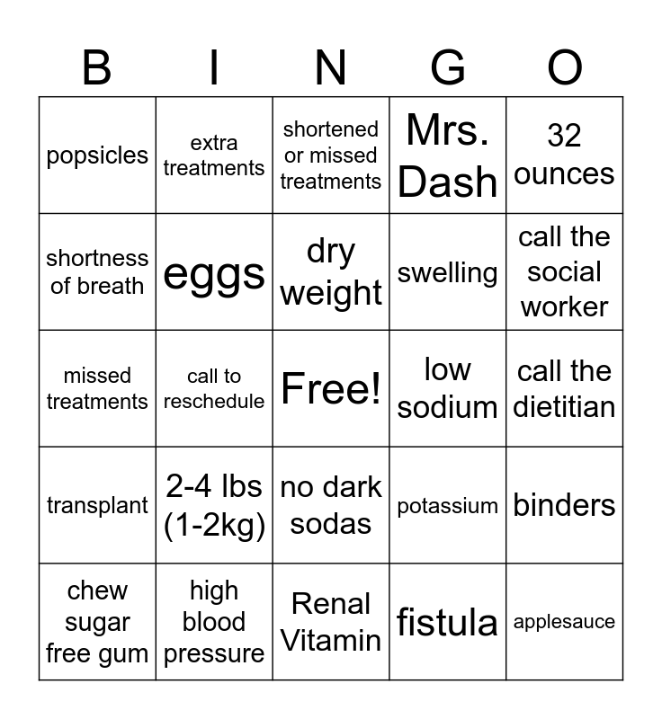 This bingo card has a free space and 24 words: 2-4 lbs (1-2kg), high blood pressure, dry weight, chew sugar free gum, 32 ounces, popsicles, shortness of breath, extra treatments, low sodium, no dark sodas, swelling, missed treatments, potassium, binders, eggs, fistula, call the dietitian, shortened or missed treatments, call the social worker, call to reschedule, applesauce, transplant, Mrs. Dash and Renal Vitamin.