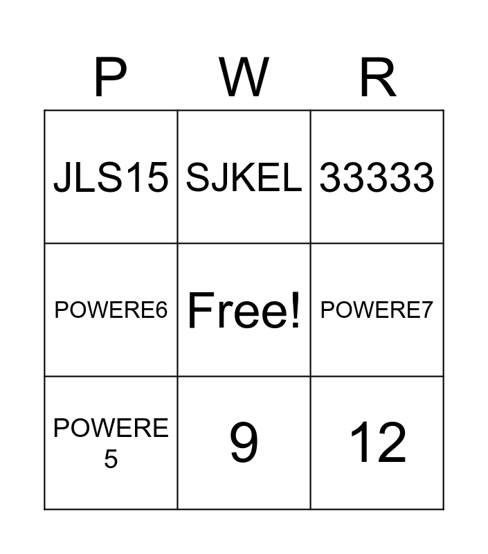This bingo card has a free space and 35 words: POWER 2, POWER 2, POWER 3, POWERE 5, POWER 5, POWERE6, POWERE7, 8, 9, 10, 11, 12, 13, JLW15, JLS15, JLW16, JLW17, JLW18, JL233, JL21, JL;111, JLDJKF, JLKWJI, 33393, 33333, 33L233, 332, STET, JLJ, JKLBJKLE, OELE, AJL, JAJL;, SJKEL and WEE.