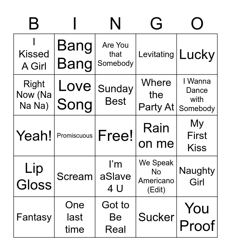 This bingo card has a free space and 68 words: Last Night, You Proof, Chicken Fired, You Look Like You Love Me, Buy U a Drank (Shawty Snappin’), Bad guy, Bang Bang, Unforgettable, Sunday Best, Yes, and?, I’m aSlave 4 U, Shallow – Radio Edit, My First Kiss, Lucky, Catch My Breath, Right Now (Na Na Na), Promiscuous, I Kissed A Girl, Beautiful Liar, Scream, Where the Party At, We Speak No Americano (Edit), Lip Gloss, Finesse, Love Don’t Cost a Thing, Skate, Doo Wop (That Thing), Halo, Naughty Girl, Perfect Duet (Ed Sheeran & Beyonce), Are You that Somebody, Bood Up, Im Every Woman, Tightrope – Big Boi Vocal Edit, Levitating, No Scrubs, Umbrella, Fantasy, I Wanna Dance with Somebody, Yeah!, Wannabe, Milkshake, Love Song, Pour Me a Drink, Gods Country, Wild Ones, Some Beach, Lips are movin, Rain on me, One last time, God Bless the USA, Save a Horse Ride A Cowboy, Born in the USA, Got to Be Real, Just the Way You Are, Scares to your Beautiful, Sucker, Lush Life, Sit Still Look Pretty, Drag Me Down, Just Like Fire, Baby, Rockabye, Galway Girl, Count On Me, Chained to Rhythm, ME! and Something Just Like This.
