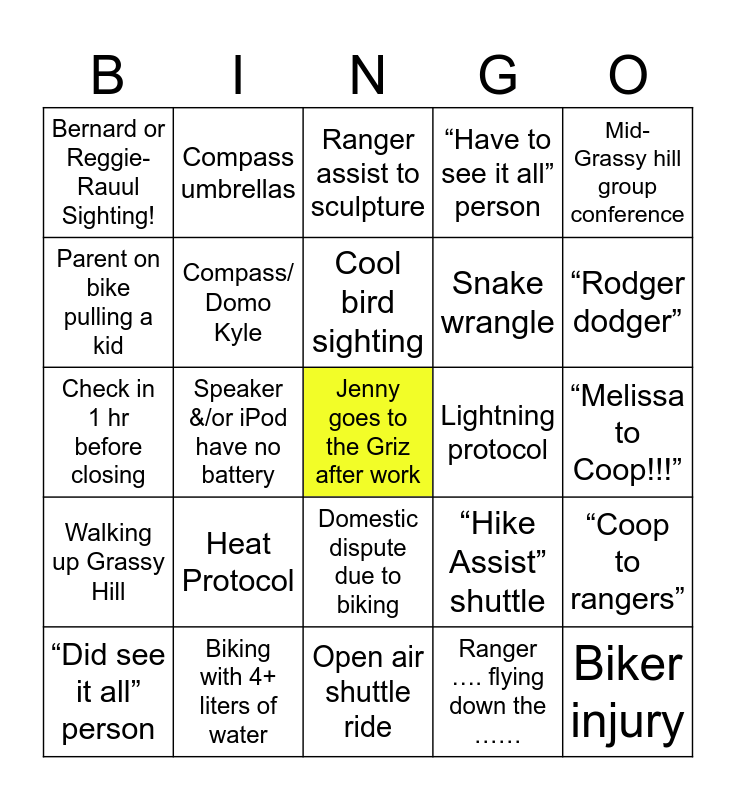 This bingo card has a free space and 27 words: “Hike Assist” shuttle, Helmet of Shame, Snake wrangle, Open air shuttle ride, Parent on bike pulling a kid, Ranger assist to sculpture, Compass umbrellas, Walking up Grassy Hill, Lightning protocol, “Coop to rangers”, Check in 1 hr before closing, “Have to see it all” person, “Did see it all” person, Biking with 4+ liters of water, “Rodger dodger”, Group of 6+, Compass/ Domo Kyle, Cool bird sighting, Heat Protocol, Bernard or Reggie-Rauul Sighting!, “Melissa to Coop!!!”, Ranger …. flying down the ……, Speaker &/or iPod have no battery, Biker injury, Domestic dispute due to biking, Mid-Grassy hill group conference and Anything but a bike helmet.