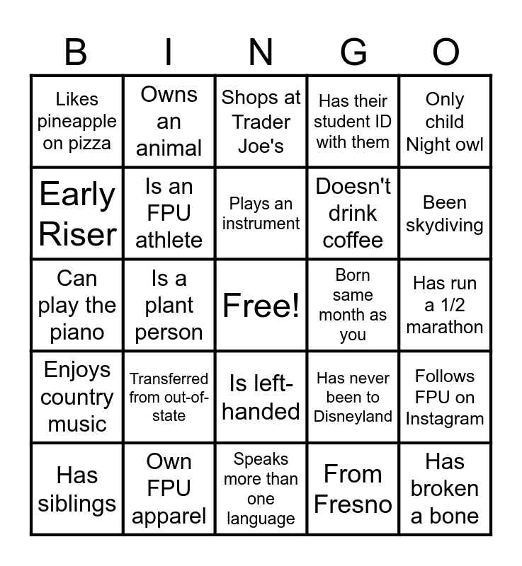This bingo card has a free space and 24 words: Transferred from out-of-state, Own FPU apparel, Plays an instrument, Has siblings, Only child Night owl, Likes pineapple on pizza, Early Riser, Owns an animal, Born same month as you, Is left-handed, Doesn't drink coffee, Can play the piano, Has never been to Disneyland, Follows FPU on Instagram, Is an FPU athlete, From Fresno, Has run a 1/2 marathon, Shops at Trader Joe's, Been skydiving, Is a plant person, Has broken a bone, Enjoys country music, Has their student ID with them and Speaks more than one language.