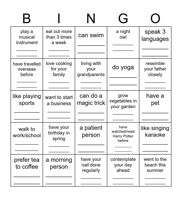 This bingo card has a free space and 24 words: have your birthday in spring ________ ________, a morning person ________ ________, living with your grandparents ________ ________, prefer tea to coffee ________ ________, speak 3 languages ________ ________, play a musical instrument ________ ________, have travelled overseas before ________ ________, eat out more than 3 times a week ________ ________, grow vegetables in your garden ________ ________, a patient person ________ ________, do yoga ________ ________, like playing sports ________ ________, have watched/read Harry Potter before ________ ________, like singing karaoke ________ ________, love cooking for your family ________ ________, contemplate your day ahead ________ ________, have a pet ________ ________, can swim ________ ________, resemble your father closely ________ ________, want to start a business ________ ________, went to the beach this summer ________ ________, walk to work/school ________ ________, a night owl ________ ________ and have your nail done regularly ________ ________.
