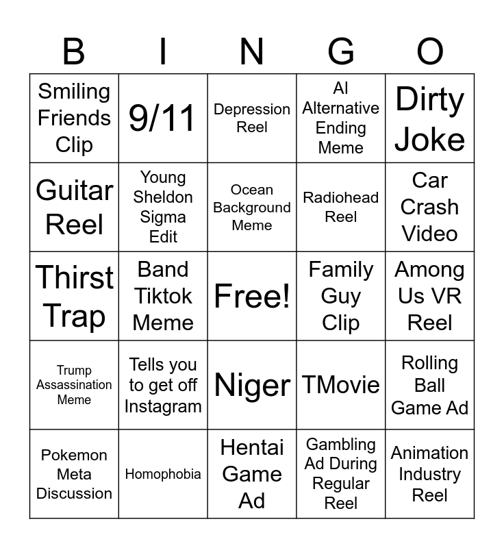 This bingo card has a free space and 24 words: Tells you to get off Instagram, Homophobia, Ocean Background Meme, Pokemon Meta Discussion, Dirty Joke, Smiling Friends Clip, Guitar Reel, 9/11, Family Guy Clip, Niger, Radiohead Reel, Thirst Trap, TMovie, Rolling Ball Game Ad, Young Sheldon Sigma Edit, Gambling Ad During Regular Reel, Among Us VR Reel, Depression Reel, Car Crash Video, Band Tiktok Meme, Animation Industry Reel, Trump Assassination Meme, AI Alternative Ending Meme and Hentai Game Ad.