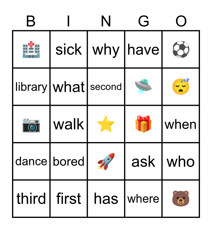 This bingo card has a free space and 24 words: bored, first, second, third, ⚽️, 🏥, library, sick, 🎁, 🚀, 🛸, 📷, ask, who, what, where, when, why, 😴, walk, 🐻, dance, have and has.