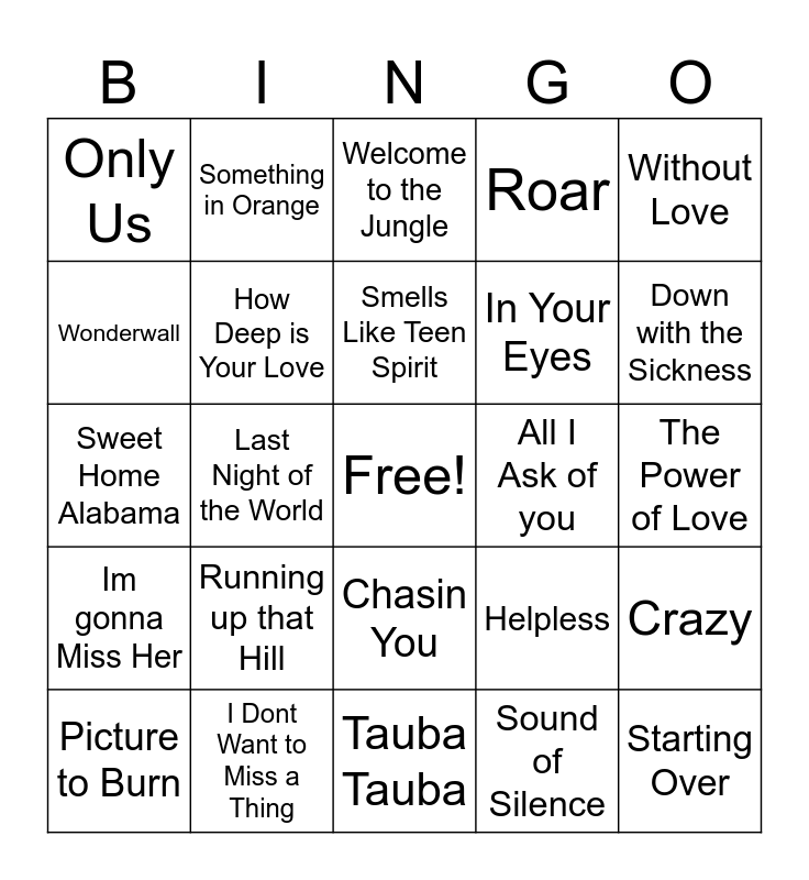This bingo card has a free space and 100 words: Let it Go, Somewhere Over the Rainbow, The Power of Love, Everything is Awesome!!, You've Got a Friend in Me, Pure Imagination, Footloose, Can't Stop the Feeling, Kiss From a Rose, Falling Slowly, Don't You ( Forget about Me ), Happy, Eye of the Tiger, I Dont Want to Miss a Thing, Shallow, Take my Breath Away, In Your Eyes, Ive had the time of my Life, I'll Cover you, People Will Say We're In Love, Somewhere, Suddenly Semour, Some Enchanted Evening, Something Wonderful, Baptize Me, All I Ask of you, Without Love, Helpless, As Long as you're Mine, Can you Feel the Love Tonight, Last Night of the World, Only Us, A Whole new World, Thunder, Sound of Silence, Smells Like Teen Spirit, Crazy, Mr. Roboto, Faithfully, Enter Sandman, Shook Me All Night Long, Hard to Handle, Sweet Home Alabama, Don't Stop Believin', Down with the Sickness, Welcome to the Jungle, Egwu, Choli Ke Peeche, Roja Roja, Tauba Tauba, Gravity, Stay Gold, Maan Meri Jaan (Afterlife), Tu Hai Kahan, Biba, Jhoome Jo Pathaan, Everlong, Smoke on the Water, Truth Hurts, Roar, Will You be there, Shake if Off, Shape of you, Sugar, Dance Monkey, Kill Bill, Love Story, Circles, We Dont Talk Anymore, Lose Control, Little Lion Man, Running up that Hill, Fireball, Never Gonna Not Dance Again, Intergalactic, Power of Love, Brandy, Wonderwall, Uptown Girl, Linger, Heart Like a Truck, Starting Over, Ole Red, Chasin You, Til You Cant, Something in Orange, Save Me, Thank God, Beautiful Crazy, Im gonna Miss Her, Standing Outside the Fire, Big Big Plans, Courtesy of the Red, White, and blue ( the Angry American), Picture to Burn, How Deep is Your Love, Take a Chance on Me, Play That Funky Music White Boy, Ive Got you babe, We are Family and I Will Survive.