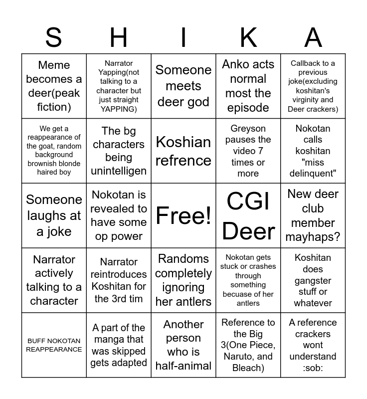 This bingo card has a free space and 34 words: Meme rice field YOO!!!, Reference to the Big 3(One Piece, Naruto, and Bleach), Reference to Koshitan's virginity, Deer Cracker Joke, Narrator actively talking to a character, The bg characters being unintelligen, Callback to a previous joke(excluding koshitan's virginity and Deer crackers), BUFF NOKOTAN REAPPEARANCE, Narrator Yapping(not talking to a character but just straight YAPPING), The menacing song thats just "Shika", Koshian refrence, Someone meets deer god, Koshitan breaks the fourth wall, Anko does something that makes me feel uncomfortable watching(practically a free space but whatever), CGI Deer, Nokotan calls koshitan "miss delinquent", A part of the manga that was skipped gets adapted, Someone laughs at a joke, Narrator reintroduces Koshitan for the 3rd tim, Nokotan gets stuck or crashes through something becuase of her antlers, Randoms completely ignoring her antlers, CGI that is NOT a deer, Meme becomes a deer(peak fiction), New deer club member mayhaps?, Another person who is half-animal, A reference crackers wont understand :sob:, Anko acts normal most the episode, Another club related to a different animal becomes rivals with the deer club, Greyson pauses the video 7 times or more, We get a reappearance of the goat, random background brownish blonde haired boy, Nokotan is actually a femboy like egg always says, Nokotan is revealed to have some op power, Koshitan does gangster stuff or whatever and A character nearly dies.
