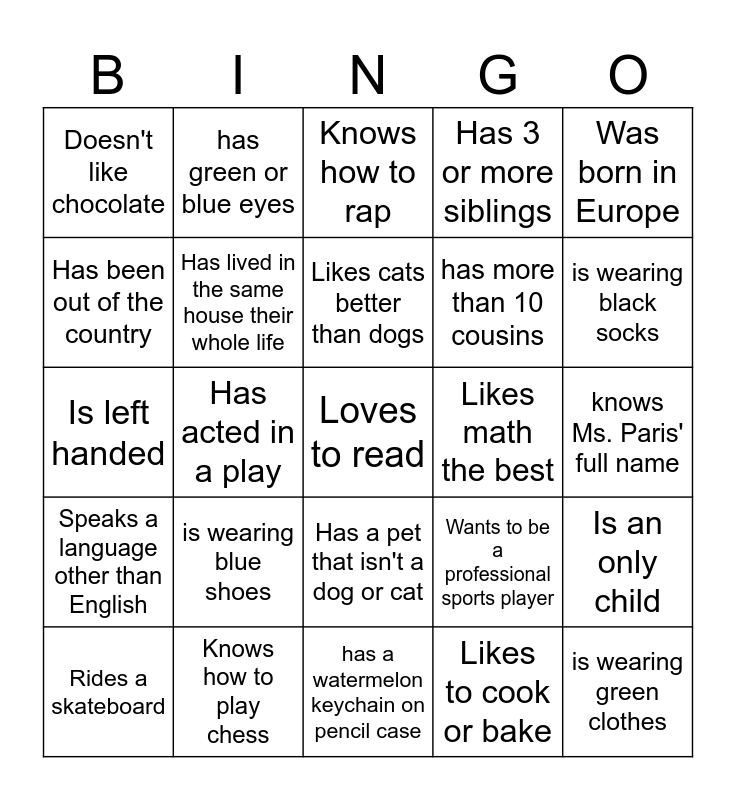This bingo card has 35 words: Has never broken a bone, Plays an instrument, Has ridden a horse, Has lived in the same house their whole life, Has a pet that isn't a dog or cat, Has 3 or more siblings, Has been out of the country, Can climb a tree, Likes cats better than dogs, Is a Hebrew school teacher, Is left handed, Was born in Europe, has a Facebook account, Has never been on an airplane, Doesn't like chocolate, Likes math the best, Likes to cook or bake, Has acted in a play, Speaks a language other than English, Loves to read, Wants to be a professional sports player, Rides a skateboard, Is an only child, Knows how to play chess, Knows how to rap, is wearing black socks, is wearing green clothes, wants to be a doctor, has more than 10 cousins, knows Ms. Paris' full name, has dissected a mouse or frog before, has a watermelon keychain on pencil case, is wearing blue shoes, has green or blue eyes and has curly hair.