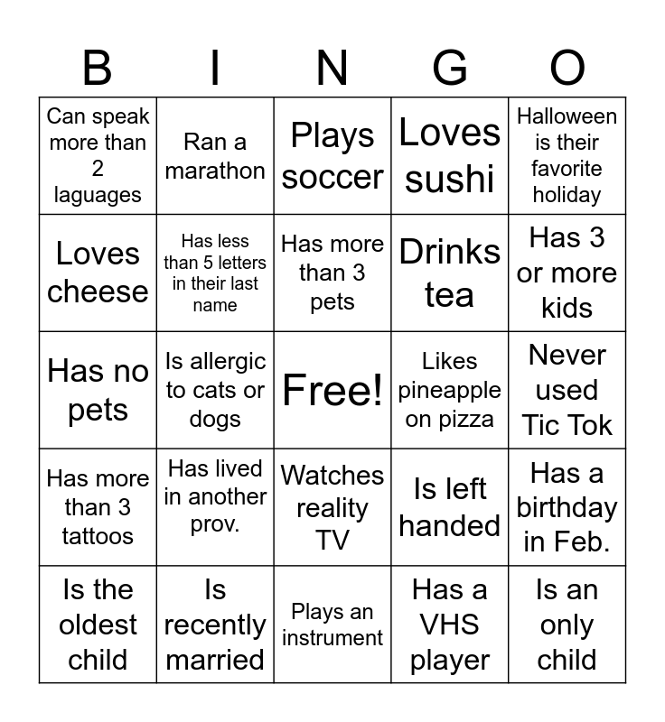 This bingo card has a free space and 24 words: Has lived in another prov., Is recently married, Has more than 3 pets, Is the oldest child, Halloween is their favorite holiday, Can speak more than 2 laguages, Loves cheese, Ran a marathon, Likes pineapple on pizza, Watches reality TV, Drinks tea, Has no pets, Is left handed, Has a birthday in Feb., Has less than 5 letters in their last name, Has a VHS player, Never used Tic Tok, Plays soccer, Has 3 or more kids, Is allergic to cats or dogs, Is an only child, Has more than 3 tattoos, Loves sushi and Plays an instrument.