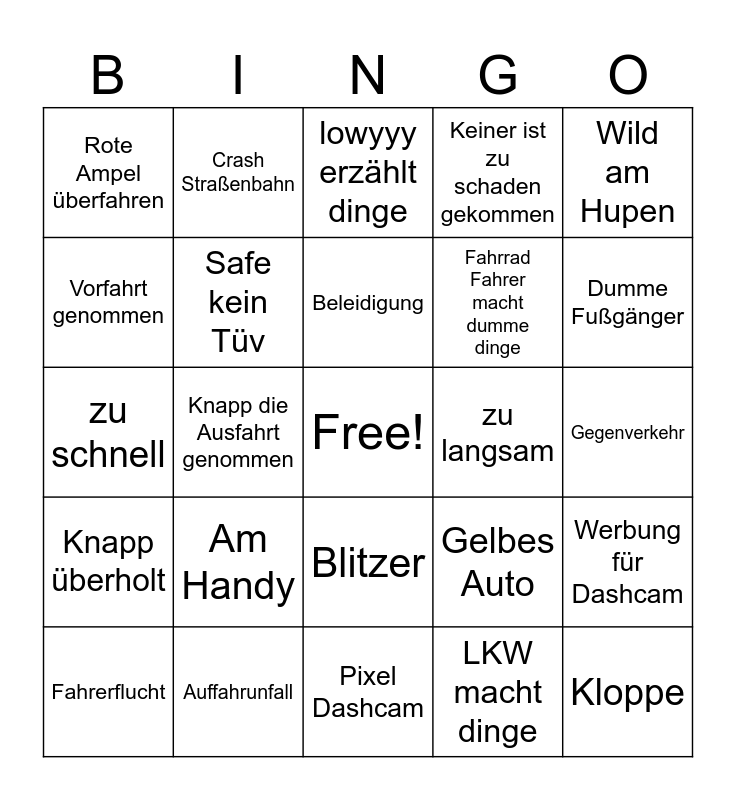 This bingo card has a free space and 24 words: Am Handy, Auffahrunfall, Beleidigung, Fahrerflucht, Wild am Hupen, Rote Ampel überfahren, Vorfahrt genommen, Crash Straßenbahn, zu langsam, Blitzer, Fahrrad Fahrer macht dumme dinge, zu schnell, Gelbes Auto, Werbung für Dashcam, Safe kein Tüv, LKW macht dinge, Gegenverkehr, lowyyy erzählt dinge, Dumme Fußgänger, Knapp die Ausfahrt genommen, Kloppe, Knapp überholt, Keiner ist zu schaden gekommen and Pixel Dashcam.