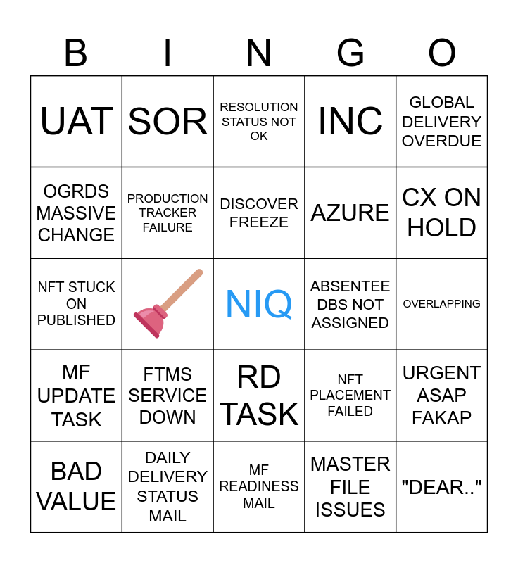 This bingo card has 1 images, a free space and 23 words: BAD VALUE, FTMS SERVICE DOWN, DISCOVER FREEZE, MASTER FILE ISSUES, GLOBAL DELIVERY OVERDUE, UAT, SOR, RESOLUTION STATUS NOT OK, ABSENTEE DBS NOT ASSIGNED, OVERLAPPING, NFT STUCK ON PUBLISHED, PRODUCTION TRACKER FAILURE, NFT PLACEMENT FAILED, URGENT ASAP FAKAP, OGRDS MASSIVE CHANGE, DAILY DELIVERY STATUS MAIL, MF READINESS MAIL, INC, CX ON HOLD, MF UPDATE TASK, RD TASK, AZURE and "DEAR..".