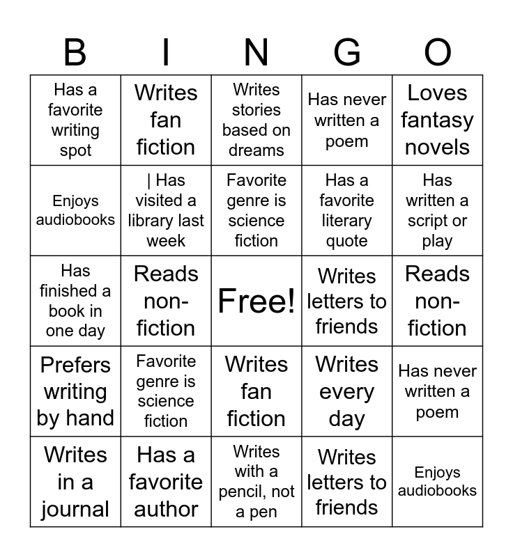 This bingo card has a free space and 73 words: Has never written a poem, Loves fantasy novels, Has a favorite writing spot, Writes in a journal, Reads before bed, Owns more than 20 books, Prefers writing by hand, Likes mystery stories, Writes every day, Has a favorite author, Reads e-books, Likes to write in a café, | Has visited a library last week, Reads non-fiction, Has participated in a writing contest, Writes fan fiction, Writes with a pencil, not a pen, Enjoys audiobooks, Has finished a book in one day, Writes letters to friends, Favorite genre is science fiction, Has never written a poem, Loves fantasy novels, Has a favorite writing spot, Writes in a journal, Reads before bed, Owns more than 20 books, Prefers writing by hand, Likes mystery stories, Writes every day, Has a favorite author, Reads e-books, Likes to write in a café, | Has visited a library last week, Reads non-fiction, Has participated in a writing contest, Writes fan fiction, Writes with a pencil, not a pen, Enjoys audiobooks, Has finished a book in one day, Writes letters to friends, Favorite genre is science fiction, Has written a script or play, Writes under a pseudonym or pen name, Enjoys listening to music while writing, Has a favorite literary quote, Writes stories based on dreams, Enjoys writing character backstories, Writes with a pencil (not a pen), Has finished a book in one day, Prefers writing by hand, Enjoys audiobooks, Reads non-fiction, Writes stories based on dreams, Has a favorite writing spot, Enjoys listening to music while writing, Reads e-books, Writes fan fiction, Has participated in a writing contest, Has a favorite literary quote, Keeps a diary, Writes under a pseudonym or pen name, Writes every day, Has written a script or play, Has visited a library last week, Writes letters to friends, Likes to write in a café, Loves fantasy novels, Has never written a poem, Likes mystery stories, Favorite genre is science fiction, Reads before bed and Enjoys writing character backstories.