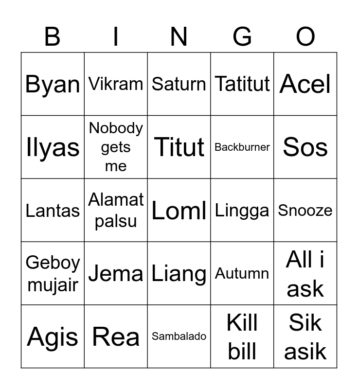 This bingo card has a free space and 24 words: Jema, Rea, Titut, Agis, Acel, Byan, Ilyas, Vikram, Lingga, Liang, Backburner, Lantas, Autumn, All i ask, Nobody gets me, Kill bill, Snooze, Saturn, Sos, Alamat palsu, Sik asik, Geboy mujair, Tatitut and Sambalado.