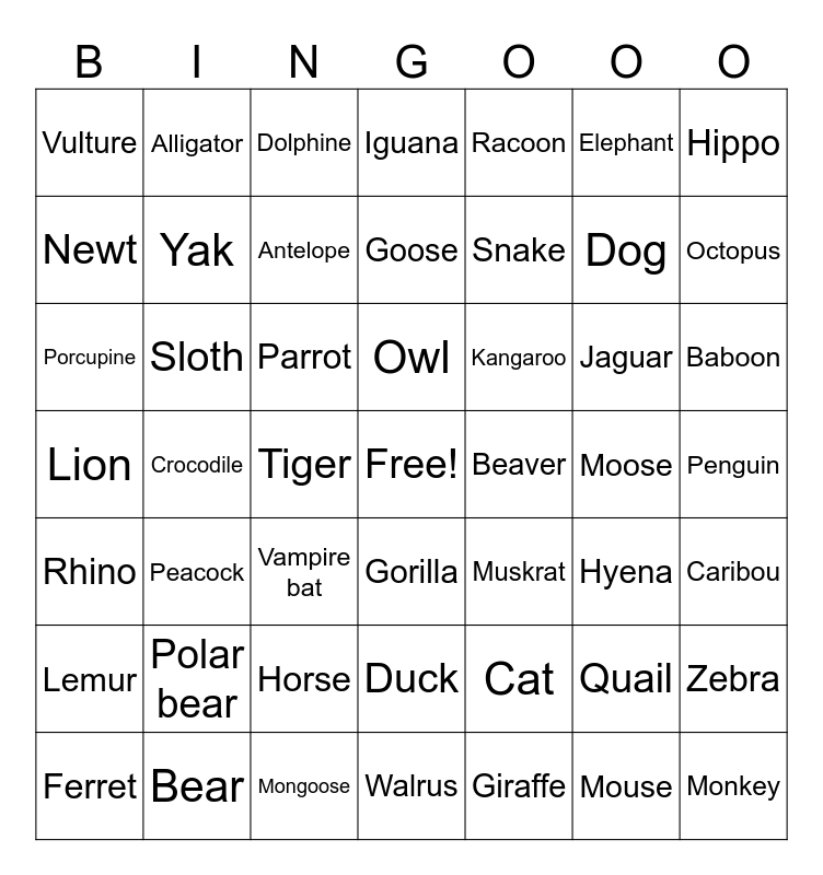 This bingo card has a free space and 48 words: Cat, Dog, Walrus, Crocodile, Parrot, Penguin, Alligator, Bear, Elephant, Gorilla, Hippo, Iguana, Jaguar, Kangaroo, Lemur, Moose, Newt, Octopus, Quail, Racoon, Snake, Tiger, Vulture, Yak, Zebra, Antelope, Baboon, Ferret, Owl, Sloth, Mouse, Beaver, Caribou, Polar bear, Lion, Muskrat, Hyena, Porcupine, Vampire bat, Horse, Rhino, Monkey, Dolphine, Mongoose, Goose, Duck, Peacock and Giraffe.