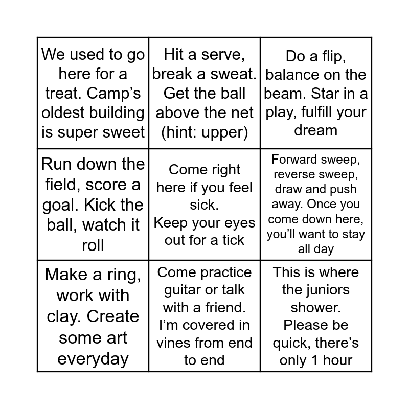 This bingo card has 14 words: Win an award, sing a song. Watch sparks flicker all night long, Ski or paddle, sail or swim. Come down to the water but don’t go in, Make a ring, work with clay. Create some art everyday, Hit a serve, break a sweat. Get the ball above the net (hint: upper), Run down the field, score a goal. Kick the ball, watch it roll, Come right here if you feel sick. Keep your eyes out for a tick, This is where the juniors shower. Please be quick, there’s only 1 hour, Shoot an arrow, show your skill. Don’t go anywhere near the ville, Come practice guitar or talk with a friend. I’m covered in vines from end to end, We used to go here for a treat. Camp’s oldest building is super sweet, We live by the swings and hop all day. During 4th period, come and play, Forward sweep, reverse sweep, draw and push away. Once you come down here, you’ll want to stay all day, Do a flip, balance on the beam. Star in a play, fulfill your dream and Command #1 is on belay. Put on your harness, climb away.