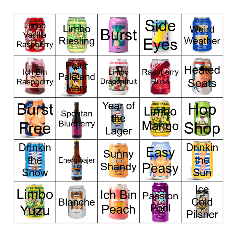 This bingo card has 25 images and 25 words: Energibajer, Ich Bin Peach, Limbo Dragonfruit, Limbo Yuzu, Weird Weather, Limbo Vanilla Raspberry, Ich Bin Raspberry, Limbo Riesling, Limbo Mango, Sunny Shandy, Raspberry Rush, Burst Free, Easy Peasy, Drinkin the Sun, Peter Pale and Mary, Ice Cold Pilsner, Hop Shop, Burst, Heated Seats, Spontan Blueberry, Year of the Lager, Blanche, Drinkin the Snow, Side Eyes and Passion Pool.