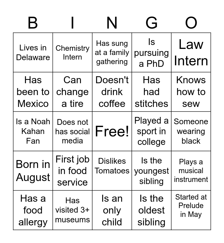 This bingo card has a free space and 49 words: Is left-handed, Started at Prelude in May, Is the youngest person here, Is an only child, First job in food service, Went on a hike this summer, Chemistry Intern, Is wearing contacts, Has been to Mexico, Is a vegetarian or vegan, Can change a tire, Is pursuing a PhD, Plays a musical instrument, Is the youngest sibling, Biology Intern, Can speak more than 1 language, Doesn't drink coffee, Played a sport in college, Has a dog, Law Intern, Does not has social media, Is the oldest sibling, Lives in Delaware, Has had stitches, Likes waking up early, Knows how to sew, Has a food allergy, Is left-handed, Dislikes Tomatoes, Born in August, Has a tattoo, Likes spicy food, Plays tennis, first job was in retail, Has visited 3+ museums, Is a twin, Has run a marathon, Someone wearing blue, Someone wearing black, Loves rom-com movies, Is the middle child, Has a bike, Is an Eagles fan, Is a Phillies fan, Is a Noah Kahan Fan, Has sung at a family gathering, Dislikes chocolate, Has met a celebrity and Has a Facebook account.