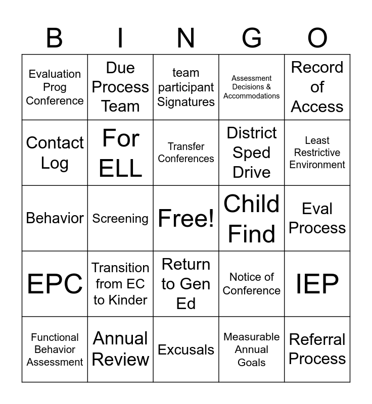 This bingo card has a free space and 52 words: Introduction, Referral Process, Sped Files and Forms, Excusals, Transition from EC to Kinder, Transfer of Rights, Due Process Team, Initial Eval, Contact Log, Response to Intervention, For ELL, Present Level, IEP, Notice of Conference, Parent Rights, Notice of Action, Transfer Conferences, Child Find, Referral Conference, Record of Access, Screening, Measurable Annual Goals, Evaluation Prog Conference, District Sped Drive, Post Secondary Goals, Consideration of Special Factors, ESY, Sched of Services, Least Restrictive Environment, Extent of participation in Gen Ed, Continuum of Placement, Assessment Decisions & Accommodations, Alternate Pathway to Grad, Parent Survey, Parent Copy of IEP, team participant Signatures, Annual Review, Failing Grades, ESY data, Re-Evals, EDR, Eval Process, EPC, Dismissal process, Return to Gen Ed, Parent Revokes Services, Summary of Performance, Behavior, Change of Placement, Manifestation Determination, Functional Behavior Assessment and Special Circumstances.