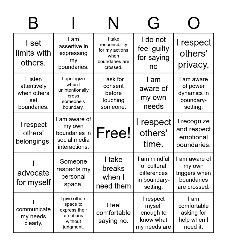 This bingo card has a free space and 25 words: Someone respects my personal space., I feel comfortable saying no., I ask for consent before touching someone., I communicate my needs clearly., I respect others' privacy., I set limits with others., I listen attentively when others set boundaries., I am assertive in expressing my boundaries., I respect others' time., I take breaks when I need them, I am aware of my own needs, I respect others' belongings., I am mindful of cultural differences in boundary-setting., I am aware of my own triggers when boundaries are crossed., I apologize when I unintentionally cross someone's boundary., I am open to discussing boundaries in my relationships., I recognize and respect emotional boundaries., I take responsibility for my actions when boundaries are crossed., I am aware of power dynamics in boundary-setting., I am aware of my own boundaries in social media interactions., I am comfortable asking for help when I need it., I give others space to express their emotions without judgment., I advocate for myself, I do not feel guilty for saying no and I respect myself enough to know what my needs are.