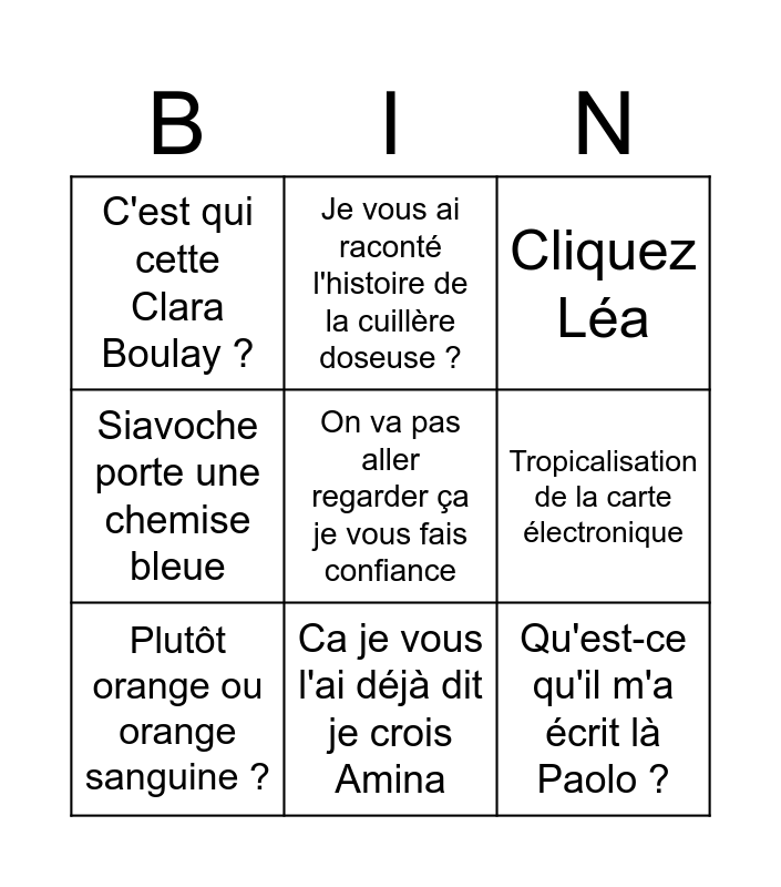 This bingo card has a free space and 8 words: Tropicalisation de la carte électronique, Cliquez Léa, Je vous ai raconté l'histoire de la cuillère doseuse ?, Plutôt orange ou orange sanguine ?, C'est qui cette Clara Boulay ?, Qu'est-ce qu'il m'a écrit là Paolo ?, Siavoche porte une chemise bleue and Ca je vous l'ai déjà dit je crois Amina.