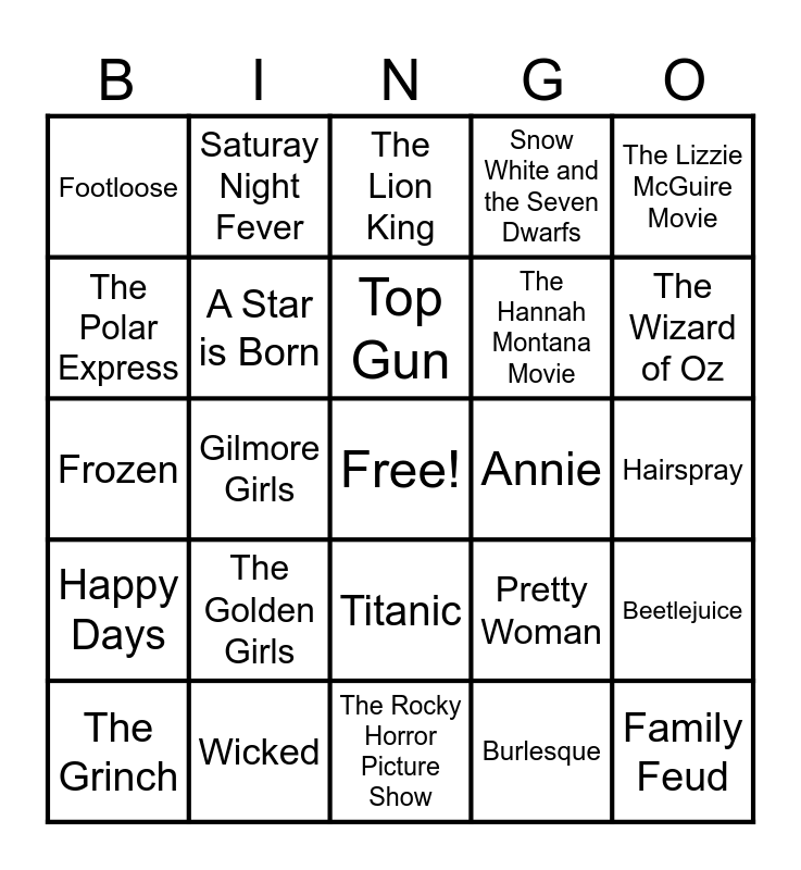 This bingo card has a free space and 24 words: The Golden Girls, Wicked, Top Gun, The Grinch, The Lizzie McGuire Movie, Footloose, The Polar Express, Saturay Night Fever, Annie, Titanic, The Hannah Montana Movie, Frozen, Pretty Woman, Beetlejuice, A Star is Born, Burlesque, Hairspray, The Lion King, The Wizard of Oz, Gilmore Girls, Family Feud, Happy Days, Snow White and the Seven Dwarfs and The Rocky Horror Picture Show.