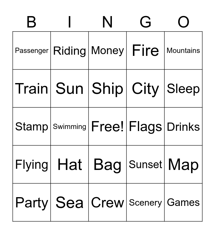 This bingo card has a free space and 41 words: Letter, Stamp, Dock, Sun, Sea, Bag, Ship, Sand, Mountains, Flying, Swimming, Fire, Games, Drinks, Flags, Hat, Tavern, Passenger, Abroad, Money, Map, Boarding, Crew, City, Club, Arrival, Scenery, Travel, Sleep, Road, Languages, Riding, Party, Tourist, Sunset, Train, Coach, Snow, Hiking, Camping and Tent.