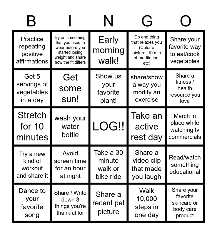 This bingo card has a free space and 29 words: Dance to your favorite song, Try a yoga workout, wash your water bottle, Compliment someone, Practice repeating positive affirmations, Early morning walk!, Get some sun!, Avoid screen time for an hour at night, Take an active rest day, Share / Write down 3 things you're thankful for, March in place while watching tv commercials, Share your favorite skincare or body care product, Share a recent pet picture, Walk 10,000 steps in one day, Share a fitness / health resource you love, Do a brain teaser/puzzle, Take a 30 minute walk or bike ride, Try a new kind of workout and share it, Share your favorite way to eat/cook vegetables, Stretch for 10 minutes, Share a video clip that made you laugh, Unplug for an hour, share/show a way you modify an exercise, Get 5 servings of vegetables in a day, Do one thing that relaxes you (Color a picture, 10 min of meditation, etc), try on something that you used to wear before you started losing weight and share how the fit differs, Read/watch something educational, Show us your favorite plant! and Complete a small task you've been putting off.